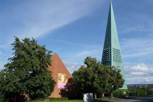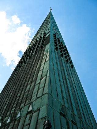 Charakteristisch für die Kirche ist der 40 Meter hohe kupferbeschlagene Turm, der wie ein Finger in den Himmel ragt und weithin zu sehen ist. Der Turm wurde erst im Juli 1963 erreichtet.