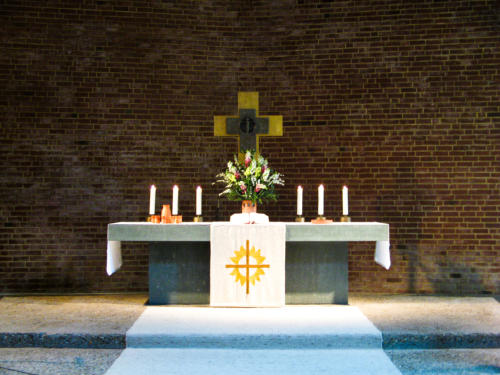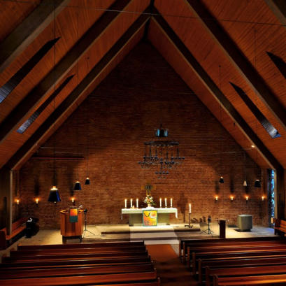 Das Kirchenschiff ist 32 Meter lang und 16 Meter breit. Die Altarwand aus roten Klinkerbacksteinen lädt zur Konzentration ein, die Decke ist mit Holz verschalt.