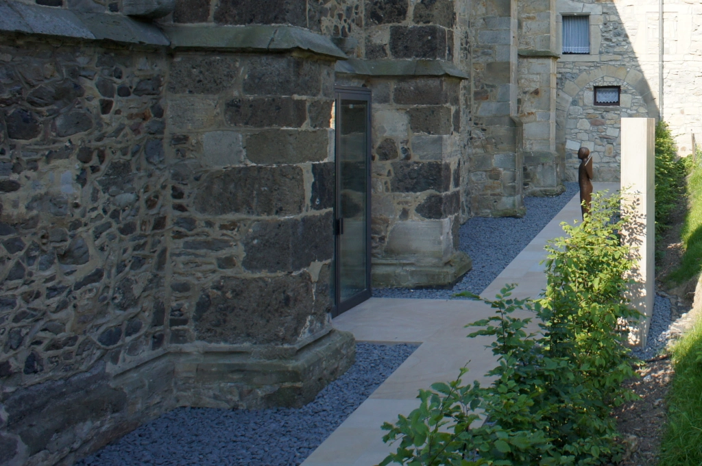 Der historische Seitenzugang wurde durch eine an der Kirchenaußenwand vorgesetzte Stahlglaskonstruktion mit einer zweiflügeligen Glastür geschlossen. Die Außenanlage wird durch einen Natursteinplattenbelag aus Weser-Buntsandstein und einer Bronzeskulptur in Sichtachse der Glastür künstlerisch gestaltet. Von dem Eingangsbereich wird in Richtung Gemeindehaus ein Weg ebenfalls mit Weser-Buntsandstein bis an den gepflasterten Hof geschaffen. Die Bauarbeiten der Außenanlage wurden im September 2013 abgeschlossen.